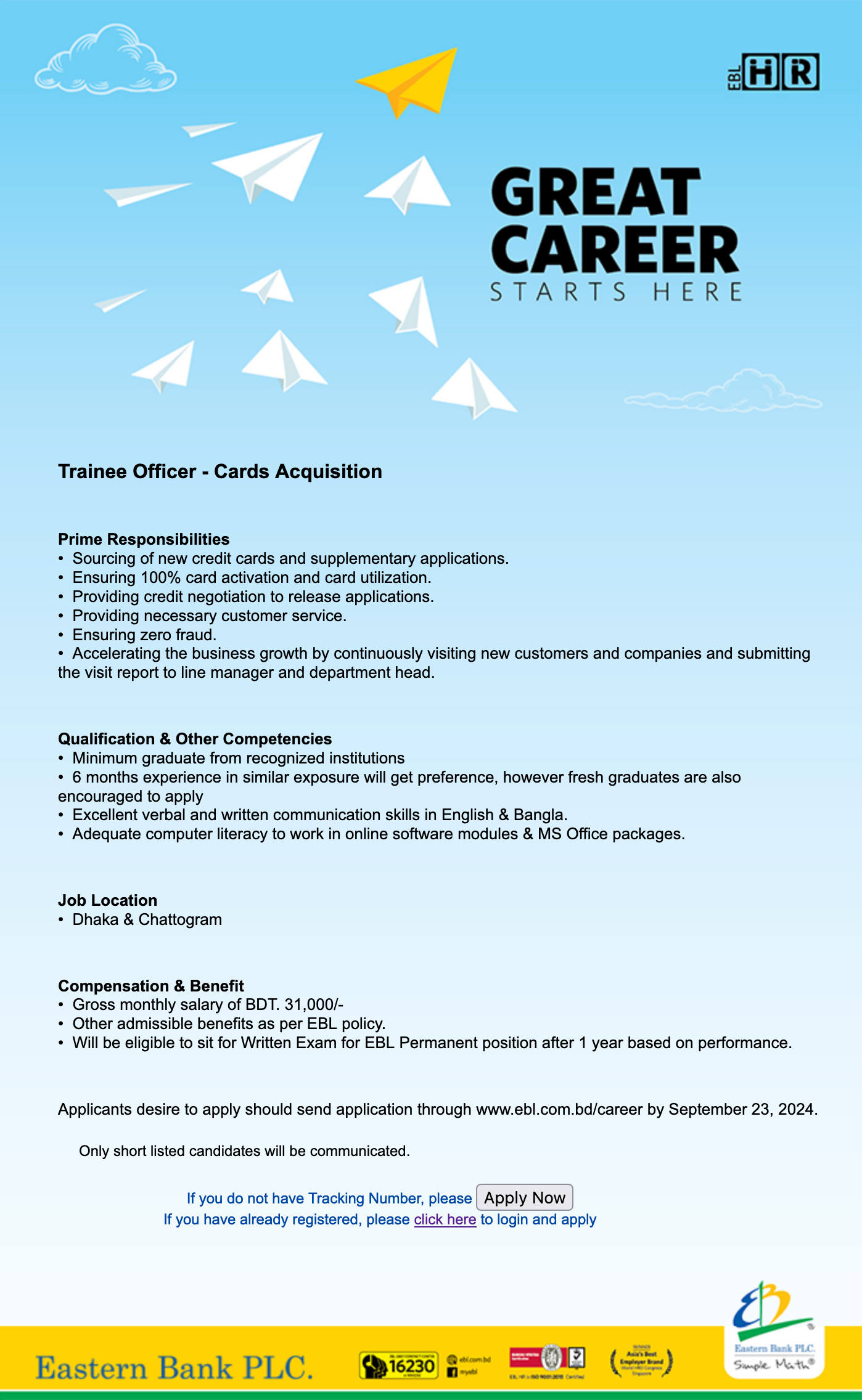 Every Bangladeshi citizen have rights to apply eastern bank job circular 2024 via online process. Are you check your educational qualification which is Eastern Bank Limited (Bangladesh) wants? Bank jobs in Bangladesh are most attractive jobs in our young generation. It’s also a first class jobs in BD. More then every young job seeker want to build his/her career with Bangladesh Bank sections. Today job circular wright about EBL job circular 2024 which is recently published. Eastern bank limited job circular 2024 offers some attraction offers for new comer. Every year eastern bank published new job circular. EBL Job Circular 2024 spans across various functional areas, catering to individuals with diverse skill sets and expertise. From banking operations to IT, marketing, risk management, and customer service, EBL offers a wide array of opportunities that suit both fresh graduates and experienced professionals. Are you interested to apply online process with eastern bank career section please follow the instruction which is provides eastern bank career menu. If you prove yourself you can join eastern bank job circular 2024.
