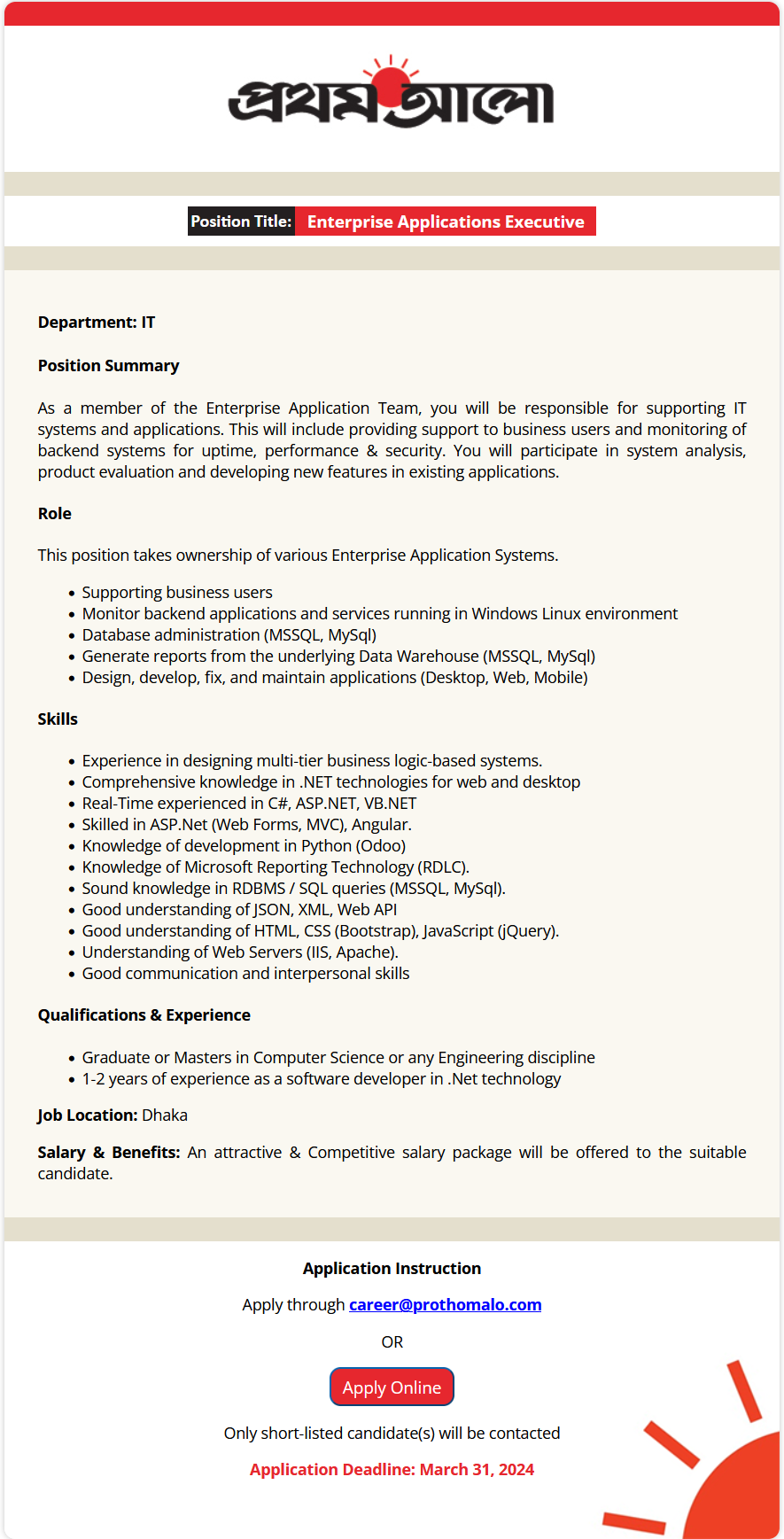 | ■ Job Title: | Prothom Alo Job circular |